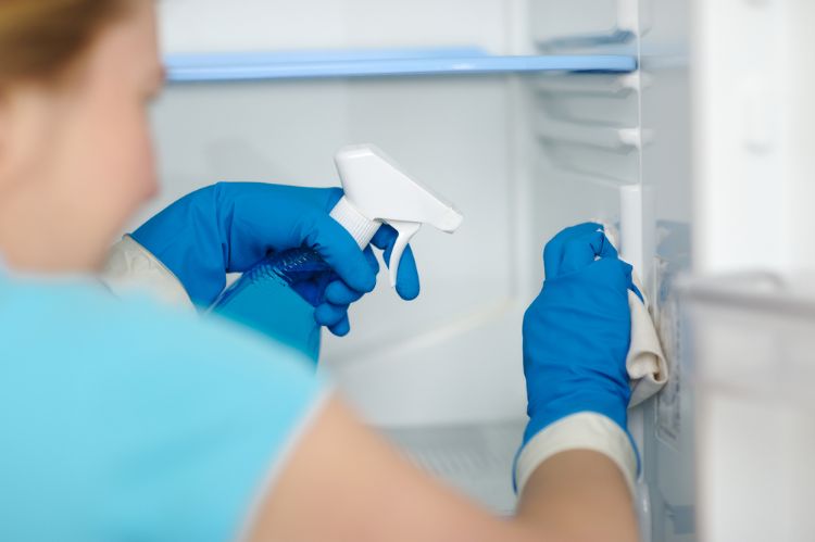 You don't want to spray strong chemicals in the same space you store your food. Vinegar gives you a gentle solution. All you need is 1/4 cup of vinegar to 3/4 cup of hot water. Add to a spray bottle, mix, spray, and wipe. As an added bonus, vinegar not only disinfects, it also deodorizes. Once dry, your fridge will simply smell clean.