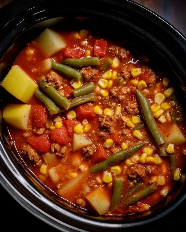 3. Add diced potatoes, mixed vegetables, sweet corn, condensed tomato soup, diced tomatoes, and cut green beans to the slow cooker.