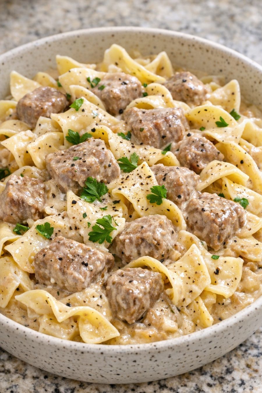 This slow cooker 5-ingredient Amish sour cream beef noodles recipe is the kind of comforting, no-fuss supper I suggest first when friends ask for something hearty and reliable. It borrows from classic Amish-style sour cream beef and noodle casseroles, but streamlines the process for a busy weeknight: you simply layer raw cubed steak in the slow cooker, dollop sour cream over the top, add just three more pantry-friendly ingredients, and let low, gentle heat do the work. The result is tender beef in a tangy, creamy sauce that soaks into egg noodles—a familiar Midwestern-style comfort dish with almost no hands-on time.