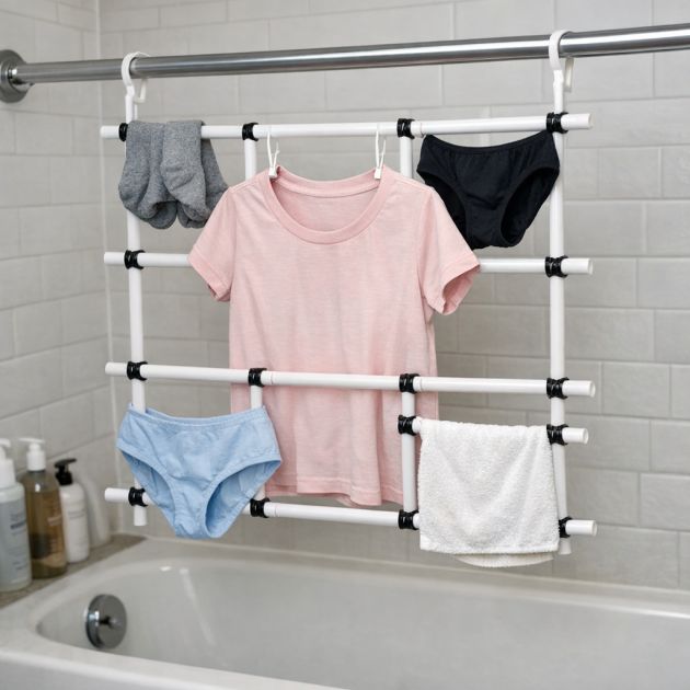 Once assembled, this structure can be hung from a shower rod or placed over a bathtub to air-dry clothing items. The plastic material is resistant to moisture, making it suitable for bathroom environments. Customize the size of the rack based on available space and the number of items you need to dry.