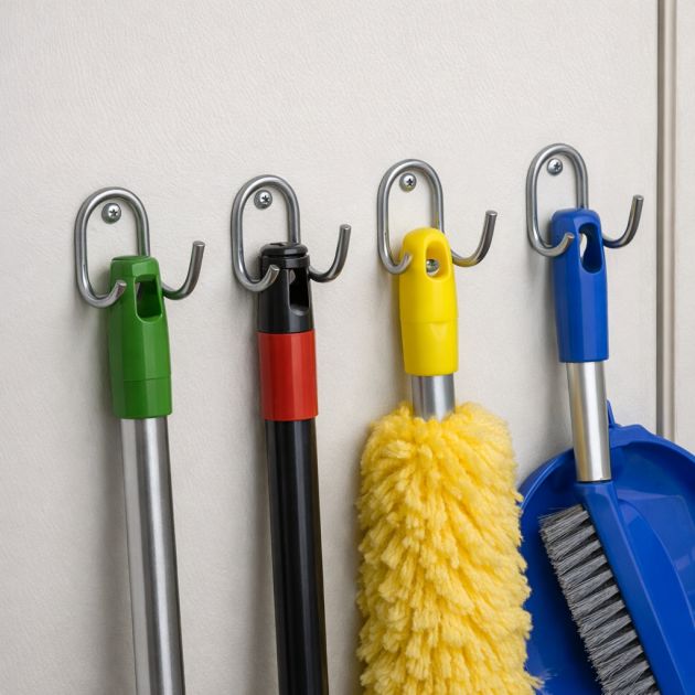Attach these hooks to a wall or the inside of a closet door using screws or adhesive hooks. Space them according to the width of the tools you plan to store. This solution keeps your cleaning supplies organized and off the floor, making your storage area more efficient and tidy.