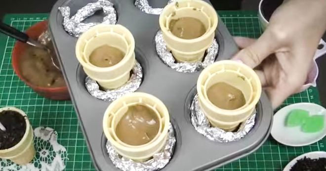 With spring around the corner, it's a perfect time to feature these flower pot cupcakes. To begin, fill the ice cream cones with the cake mix of your choice.