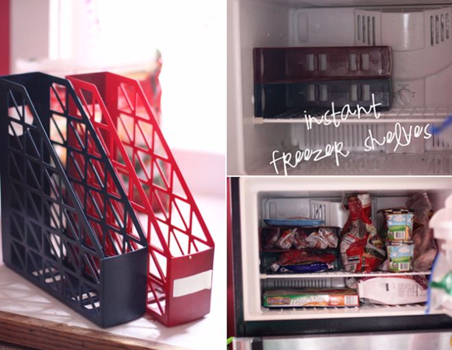 Not enough shelf space in the freezer? A few plastic magazine racks provide instant storage for small bags of frozen foods or frozen entree boxes.