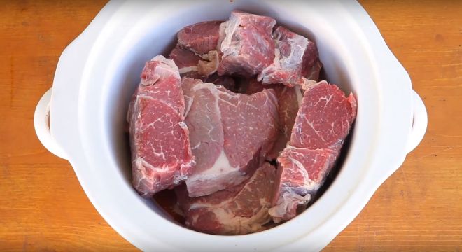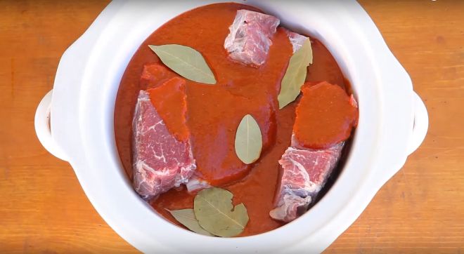Combining chipotle peppers, beef broth, garlic, onions and lemon juice, you can create the base sauce in a blender. Spread a little bit on the bottom of your slow cooker before adding the ribs.