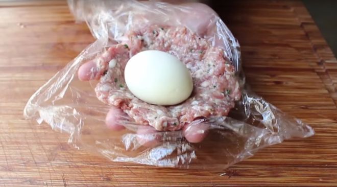 To start out, you'll need some ground sausage and a soft boiled egg. You'll be wrapping the egg in the sausage, so make sure to give yourself enough room.