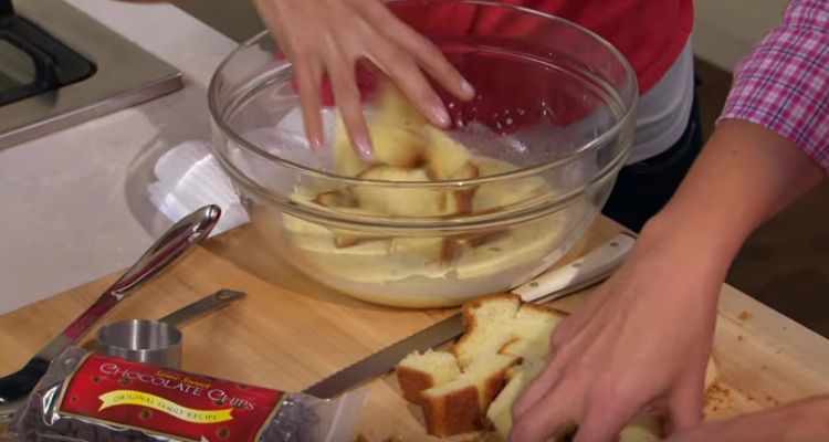 2. Add the cubed bread to the custard mixture, stirring thoroughly to coat all the bread. Tip: Let the mixture stand for 15 minutes, so the brioche can absorb most of the liquid.