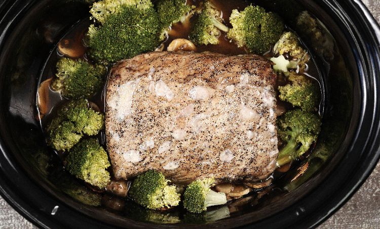 Remove slow cooker pot from base and partially open lid to release steam. Allow to rest for 30 minutes before slicing pork loin and serving. The resting process keeps the pork moist and allows the broccoli to become tender.