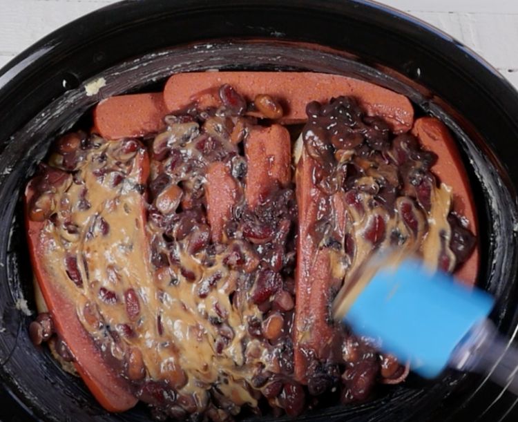 2. Layer hot dog buns in the bottom of the slow cooker.