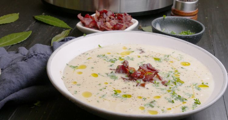 This recipe is so simple, it requires no steps outside of the slow cooker. I love how simple it is. First you add in celery, onion and garlic then sprinkle just a touch of flour over top and mix to help with thickening. I like to use low sodium chicken stock but you can just as easily use water. I try to refrain from using veg stock because I just don't like the way store bought taste. Add in thyme, cream cheese, bay leaf salt and pepper and just let it cook. I use an emersion blender to pulse it a bit, still keeping slightly chunky. This is the time I add lemon juice and the cold butter to brighten it and bring it all together.