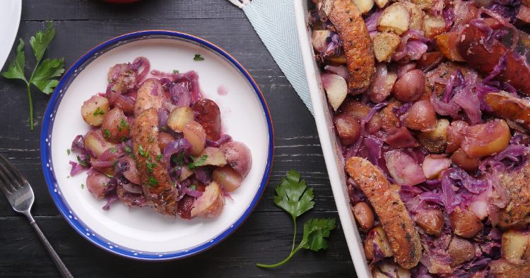 Arrange 1/3 of the cabbage in an even layer in the baking dish. Layer half of the sausage, half of the apples, half of the potatoes, and half of the onion on top of the cabbage. Drizzle with a bit of olive oil over the top and season with salt and pepper. Top with half of the remaining cabbage and then layer the remaining sausage, apples, potatoes, and onion. Top with the remaining cabbage, drizzle with a bit of olive oil, and season with salt and pepper. Cover with foil and bake for 1 hour, removing the foil cover halfway through.