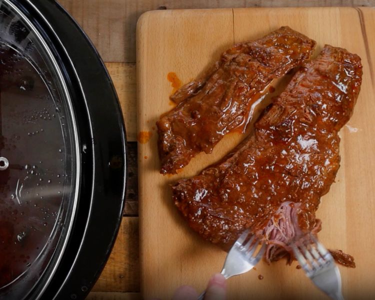 5. Using two forks, shred the flank steak and return pieces to the slow cooker. Mix to combine meat with the sauce that has formed. Taste and adjust salt if necessary.