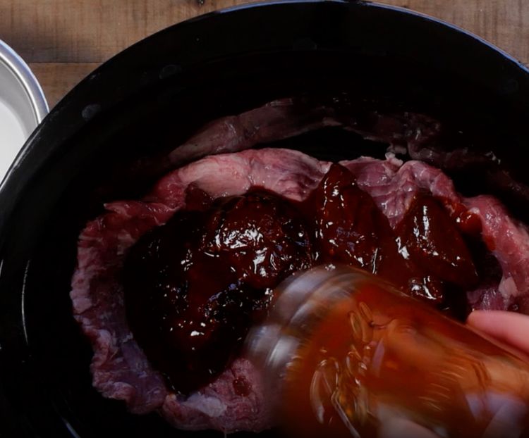 1. Generously season the flank steak on both sides with salt and place in the bottom of a 6-quart slow cooker.