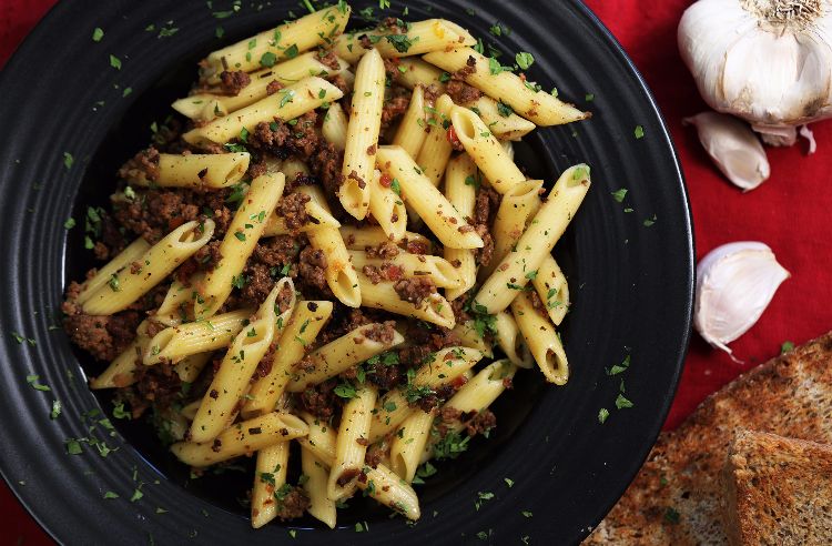 We start by adding browned ground beef into a slow cooker along with garlic, sun-dried tomatoes, water and finely chopped fresh rosemary. This simmers together slowly, bringing all the flavors together. Then we stir Parmesan cheese into the mixture. To finish it off, we add the cooked penne and gently toss it in all that goodness.