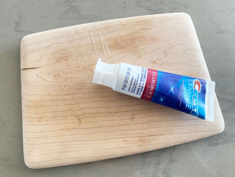 If your wooden cutting board is starting to look a little grungy, you can mix white, non-gel toothpaste and baking soda into a paste and rub it into the board, parallel to the grain. After you've rubbed down the board, wipe off the paste with a damp cloth.