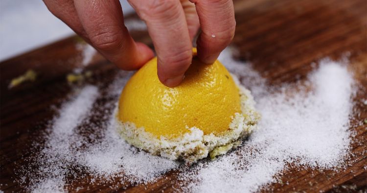 If you have a wooden cutting board, you can use salt and lemon to clean it. Sprinkle salt over the board and then scrub over it with half of the lemon, squeezing gently so the juice runs out onto the board. Let it sit until a gray liquid forms on the board. Scrape the liquid off and then wipe the board with a wet cloth to remove any residue.
