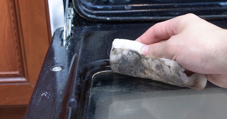The easiest way to remove the baked-on grime from your glass oven door is your handy Magic Eraser. It gently removes tough residue with hardly any effort. Just dampen the sponge and rub it gently on the glass.