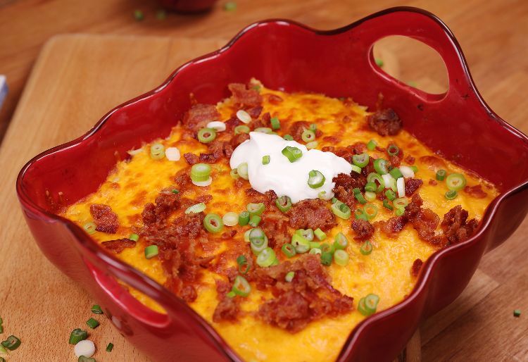 Add in half the sour cream, bacon, half the cheese, half the green onions, butter, garlic, paprika, salt and pepper to taste.