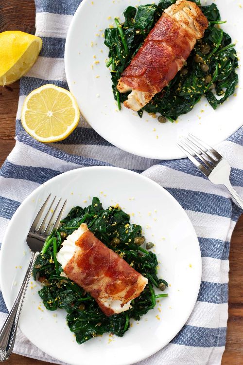 4. Prosciutto-wrapped cod with lemon caper spinach (h/t Kit's Coastal)