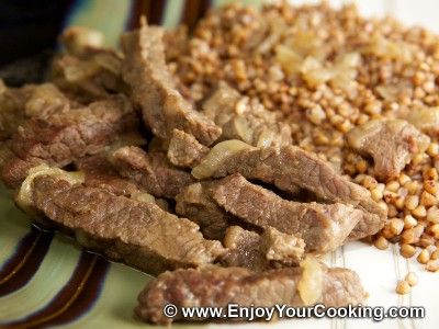 This tasty beef stroganoff is based on the blogger's mom's recipe, so it's really a classic! It's shown here with boiled buckwheat, but it's also delicious with mashed or pureed potatoes.