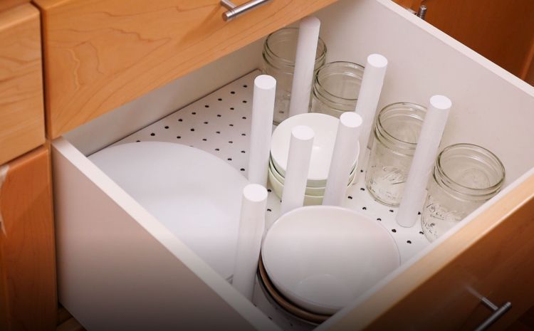 Here's a clever solution. Keep all your different-sized dishes in place as you slide the drawer open and closed. Just grab a pinboard and some spools to place in the right spots.