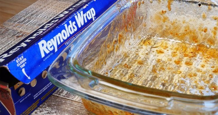 Need to scrub stuck-on debris from your glass cookware? Try using tin foil! Scrunch the foil into a ball, add a little soap and water, and scrub away. It works like a steel-wool pad.