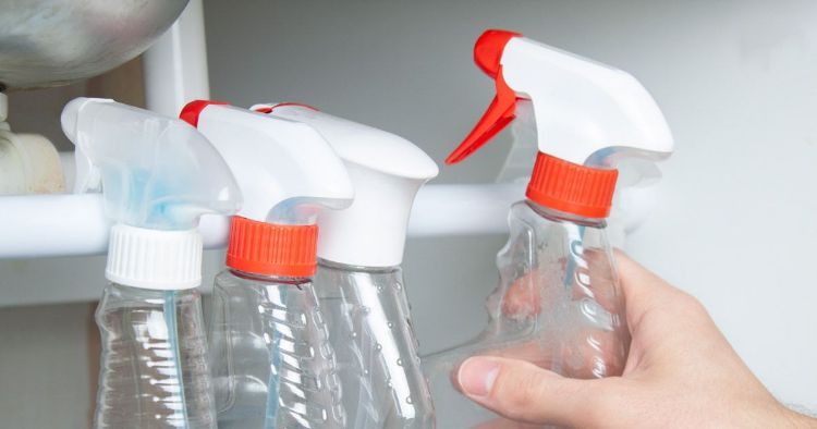 Another easy organization trick is adding a tension rod under your sink. You can drape all your spray bottles on the rod for easy access.