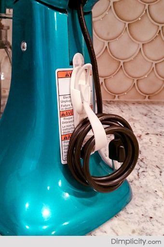 Command cord bundlers create an easy way to wrap up appliance cords and keep them from cluttering up your counters. If you can't find this creative product in your local store, you can create your own by placing two hooks on the back of your appliance and wrapping the cord around the hooks. Tuck the plug through your wraps to hold it in place.