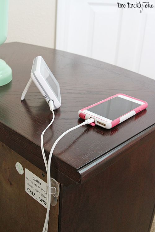 Cell phone cords next to a bed-side table look messy. Not only that, they also fall on the floor, leaving you digging around to find them. Keep them neatly tucked away and easy to find with a simple cord clip. Available online and through department stores, the Command version will not damage walls or furniture. You simply place them wherever you need them to guide your cords.