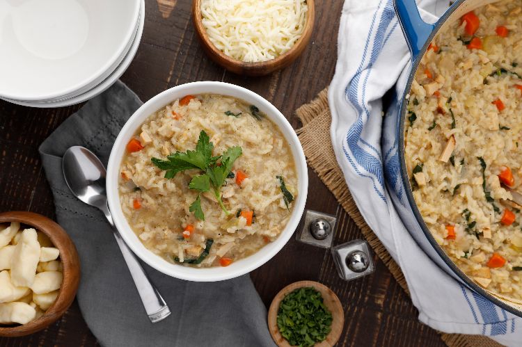 Of course, Thanksgiving doesn't roll around every day, and it's just as easy to make this recipe when you don't have leftovers lying around. Just sub the turkey stock with store-bought or homemade chicken broth, and use poached turkey breast in place of the leftover roast turkey.
