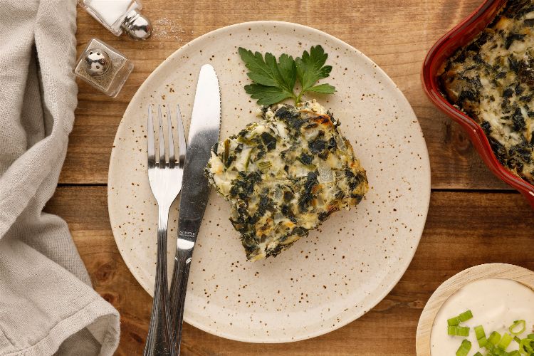 Of course, you could use regular cheese in this casserole. But why do that when you can substitute cottage cheese and cut down on even more calories? And, it's delicious! It makes the perfect filler and let's be honest, you won't even notice that it's lower-calorie cottage cheese rather than fatty other stuff. And there's a little it of that in there too, so don't think you'll be sacrificing on flavor. In fact, with this dish, you won't feel as though you're sacrificing anything at all. And it might just become your new favorite way to enjoy spanakopita.