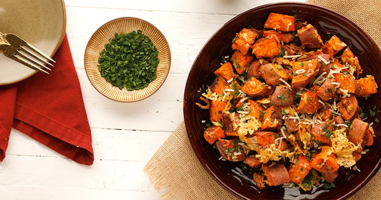 Change up your regular roasted veggies with a bit of pizzazz. The recipe below combines rustic, comforting roasted sweet potatoes with a hint of Parmesan and garlic. The result is a great side to dress up a simple main.