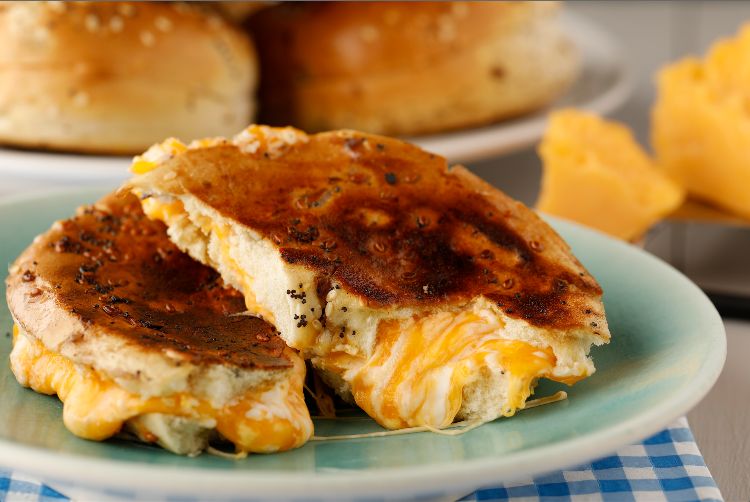 We often pair bagels with cream cheese, but what about with cheddar? In the recipe below, a mashup of two American classics, an everything bagel is filled, not with cream cheese, but with a combo of cream cheese and cheddar. It is then griddled like a grilled cheese for the perfect sandwich.