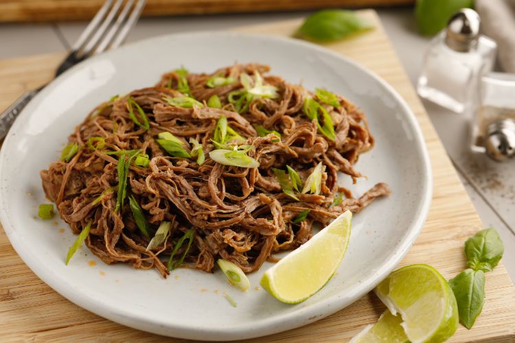 Spoon the shredded steak onto a platter and top with sliced green onions.