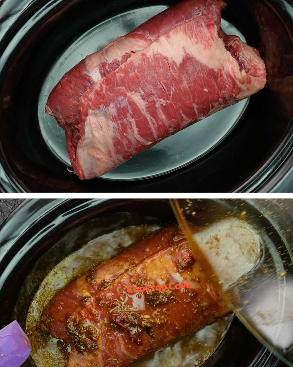 Pour the mixture from the bowl over the flank steak in the slow cooker.