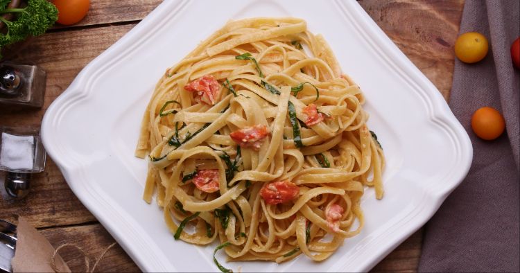 Add dried fettuccini noodles, and cook according to the packaging for "al dente," about 7-9 mins. Reserve one cup of pasta water. Drain rest of the water and return pasta to pot.