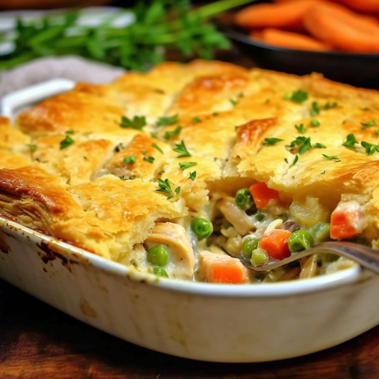 The classic recipe of chicken pot pie features chicken, peas, carrots and potatoes, but in reality you can substitute in your favorite vegetables. What are you waiting for? Get ready to impress guests and family members with the recipe below.