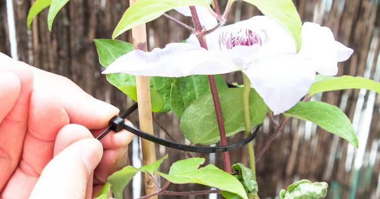 Plants such as tomatoes and cucumbers need a little extra support to grow properly. Use a zip tie to gently attach the vines to a stake, as pictured above. They hold up under the weather and you can cut off the ties easily after the growing season.