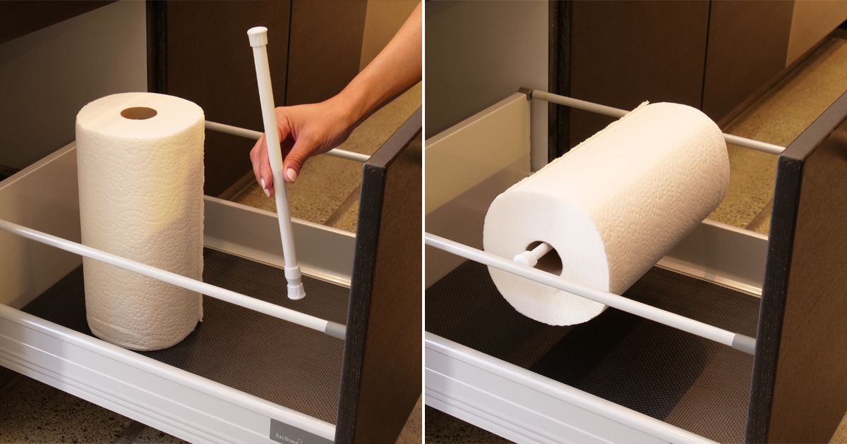 A roll of paper towels is essential for a clean kitchen, but they can be a bit of an eyesore when sitting on the countertop. Keep towels hidden but accessible with a tension rod inside a deep drawer. To get even more out of the drawer, consider adding a second rod to organize cleaning supplies like in idea #1. All your tools for tidying up are now in one convenient place.