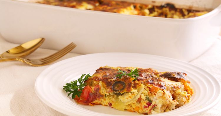 The omelette casserole is filled with distinctive Greek flavors: Roasted tomatoes, artichoke hearts, olives, feta cheese and herbs unite for a casserole as flavorful as it is colorful. Vegetarian, low-carb and delicious, it's a surefire crowd-pleaser!