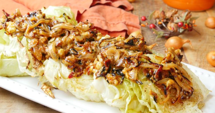 Tender, slightly sweet cabbage steaks make a guilt-free base for the main event: a creamy bleu cheese and bacon sauce packing the right amount of salty, tangy and meaty flavor. Plus, this dish is ideal for appeasing the vegetarians, who can forego the bacon and instead make a simple garlic butter, lemon or balsamic glaze, and the meat eaters too. For big fans of the sauce, double the quantities, and save the extra for dipping!