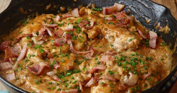 Bring the mixture to a simmer and then return the chicken to the skillet and allow to gently simmer for 3-5 minutes. Remove from the heat, garnish with chives, and serve immediately.