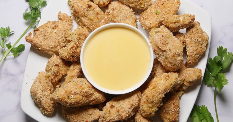 Nuggets are a crowd-pleaser, especially if that crowd is made up of children, but making them at home is so much better than getting them at a restaurant. This version is oven-baked on a wire rack, so the nuggets are crispy all over without ever being fried. This low-fat cooking method means you have some wiggle room when it comes to condiments, and the perfect dipping sauce (other than ketchup) is this gooey cheddar cheese sauce.