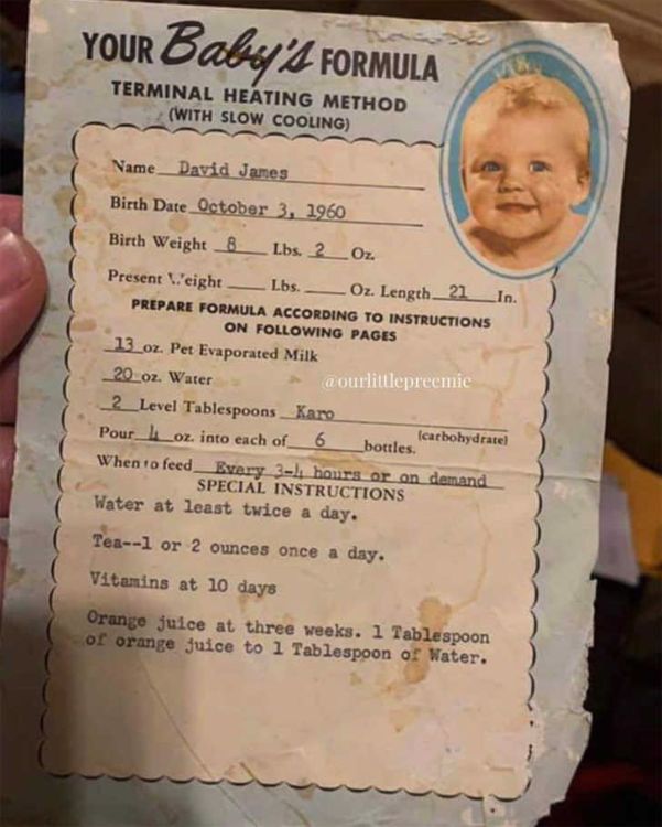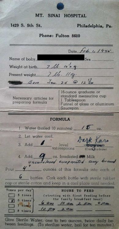 The basic recipe includes evaporated milk, water and Karo. Many doctors often sent home formula recipes with the parents, assuming the mother was not going to breastfeed.