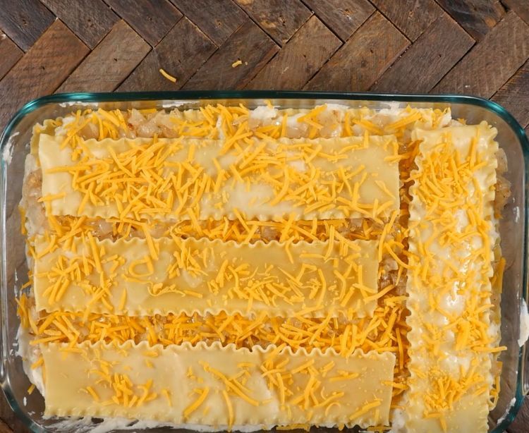 Spread 1/2 of the buttered onion on top of the potatoes. Then, sprinkle 1/3 of the shredded cheese on top. Repeat layers once more, then top with a final layer of noodles and the remaining cheddar cheese.