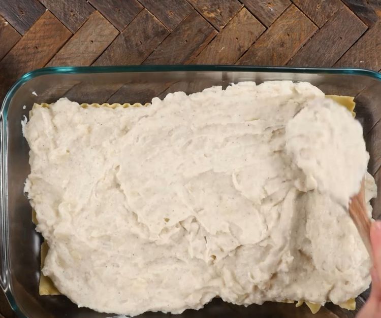 Evenly spread 1/2 of the mashed potato on top of the noodles.
