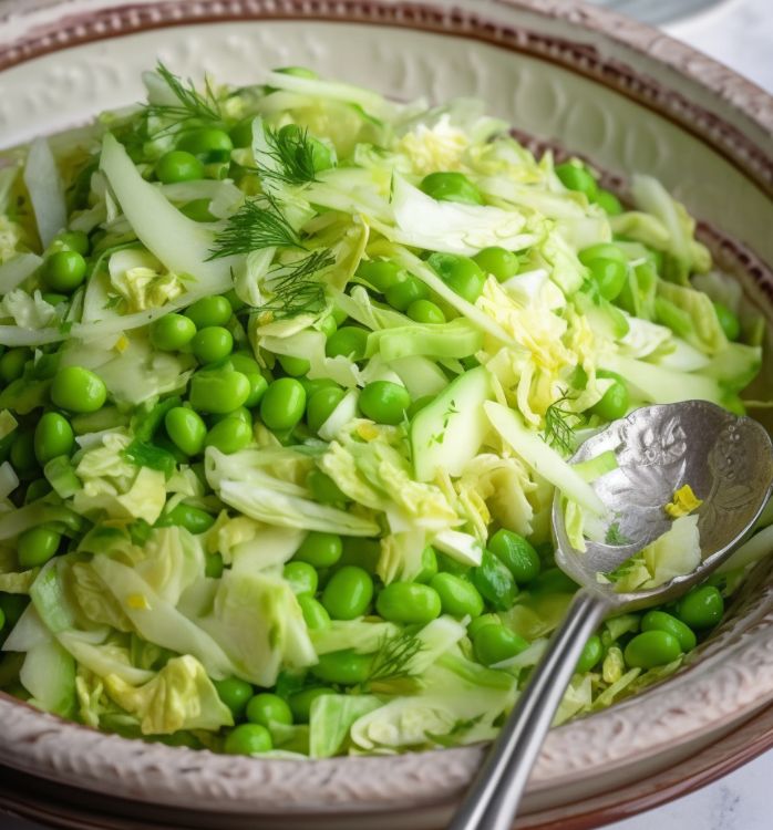 1. In a large bowl, combine the cabbage, cucumber, and peas.