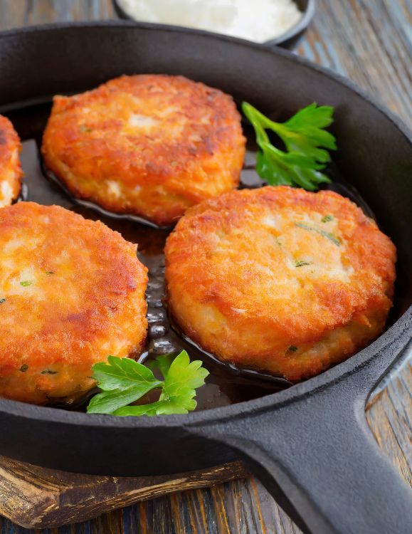 4. Carefully place the chilled salmon patties into the hot oil, working in batches to avoid overcrowding the pan. Fry for about 3-4 minutes on each side, or until they are golden brown and crispy.