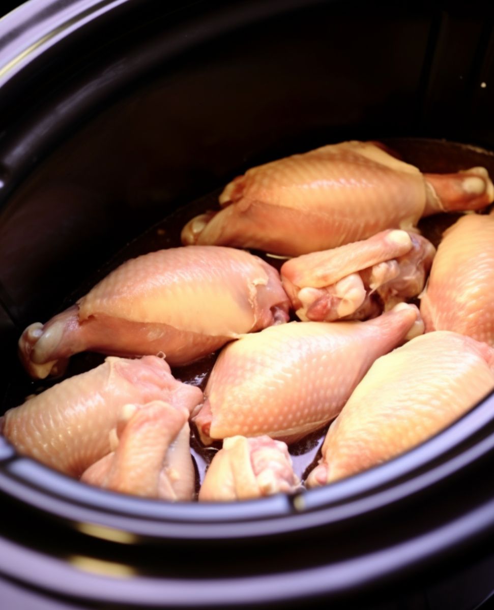 4. Now, add the chicken drumsticks on top of the onions and garlic in an even layer.