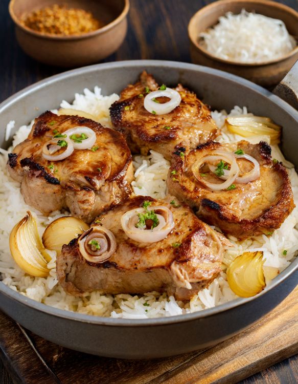 Serve the pork chops over a bed of rice and onions, spooning some of the flavorful juices over the top.