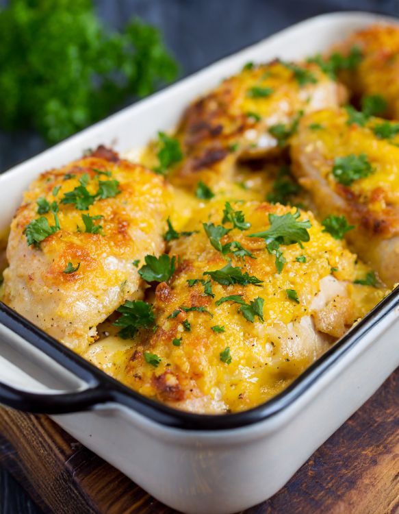 6. Bake for 60 minutes, or until the chicken is cooked through and the cheese is melted and bubbly.